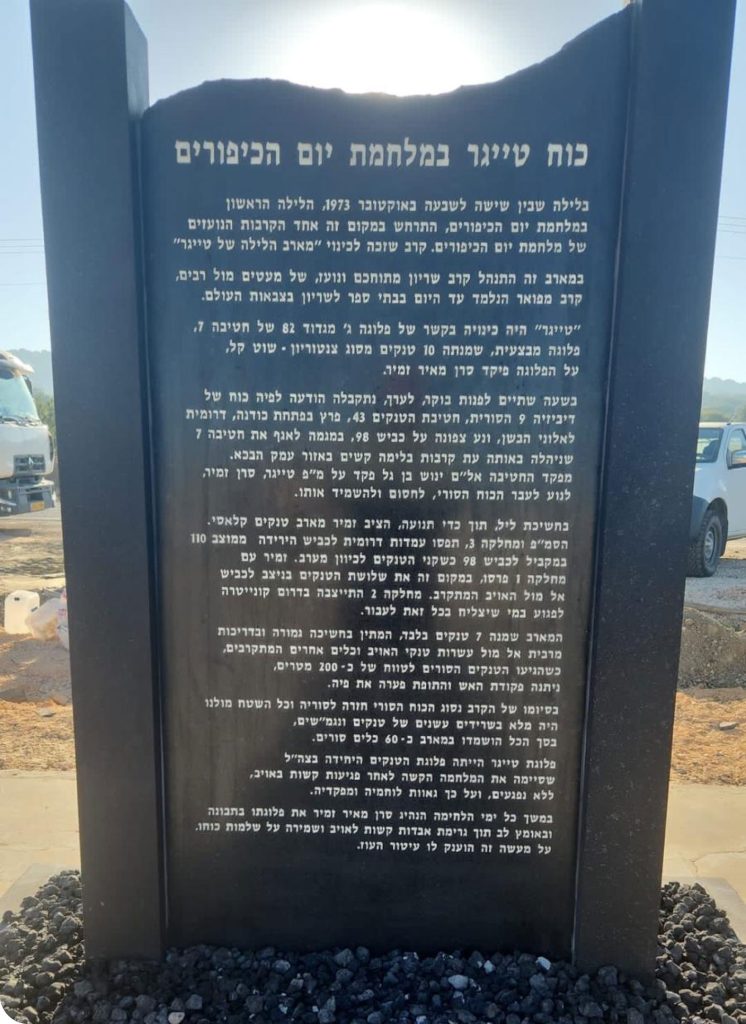 במקום זה ממש, בלילה שבין שישה לשבעה באוקטובר 1973, הלילה הראשון של ‘מלחמת יום הכיפורים’, התרחש אחד הקרבות הנועזים של המלחמה – קרב שזכה לכינוי “ מארב הלילה של טייגר”.